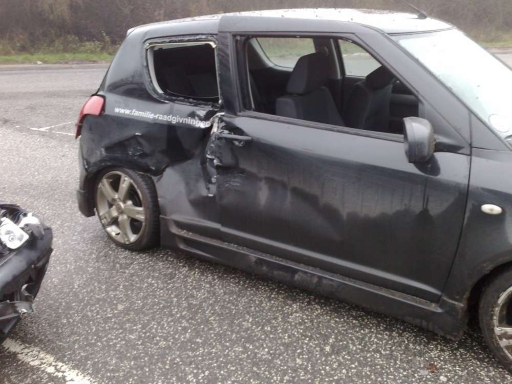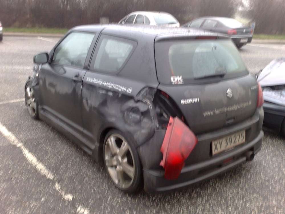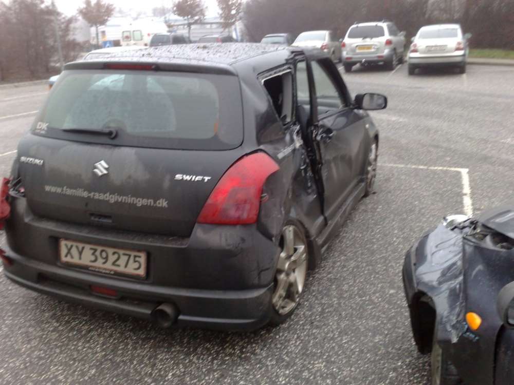 Beskrivelse: Søndag den 16. december skulle swiften luftes og det gik desværre galt da der var en der valgte at trække ud i højre vognbane, på motorvejen, ca. 50 før jeg lå på siden af ham. Det gav dette resultat. Det skal lige nævnes at det var spejlglat og jeg derfor lå med ca. 80 på motervejen og ingen mulighed havde for at undgå uheldet men der er ikke sket de store personskader.